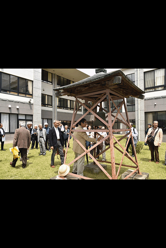 正 門 巨木のクスノキ、中28卒業50周年記念樹シラカシ、高22卒業記念樹シラカシ、高32卒業記念樹サザンカ、高26卒業記念樹ツツジ、ホイットマン高校交流記念樹ハナミズキを説明。